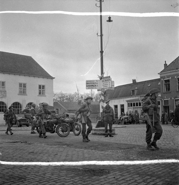 Caption: Infantrymen of Le Régiment de Maisonneuve moving through Terborg, Netherlands, 1 April 1945.