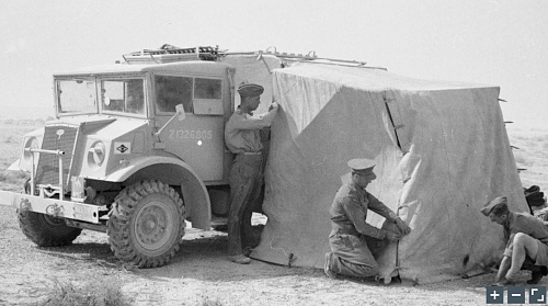Although it's resolution is not great, you can see a frame fitted to the side of the canopy and rolls of canvas on top: I recalled seeing this frame on 15-cwt truck before, and today I happened to come across a picture depicting the use of this frame. It looks it was used to attach an office tent to the (possibly both) side(s) of the truck: Caption: A CMP Chevrolet truck in use by AFPU cameramen in the Western Desert, 28 April 1942 Question: Does anyone know more about this variant? Thanks!