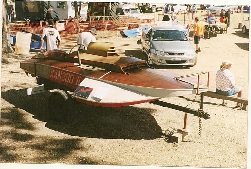 Attachment 74332 Attachment 74333 This Tail-dragger Hydroplane is recognized as the oldest in Australia. It was built in Moe Vic. in 1947 by a chap named Howlett for Charlie Moffit. It is built to a plan patented in the USA in 1937 and was originally powered by a 21 stud Ford 60hp engine. Charlie Moffit raced it as "Kandoo II' with much success throughout Australia but sold it to Charlie McCallum in 1957. After blowing the Lynx diff, Charlie McC. removed the engine from the Lynx with the broken diff and fitted it into the boat. Charlie built a trailer for the boat and renamed the boat "GUNNER". Lake Omeo at Benambra Vic. is a very shallow lake and Charlie was only able to race the boat for two years at Benambra.(1958/1959). In 1960 there was not enough water in Lake Omeo to hold a race meeting so the boat was parked up in the shed and the rest is history. In building the trailer he cut off the front Shock absorber mounts and welded them to the frame as the rear spring shackles. Attachment 74334 Attachment 74335 If you look carefully you will see that the carburetor is facing the opposite way to normal for a Ford V8. It is facing the gearbox end not the fan end.This was because they discovered with the Lynx that the fuel bowl on the carby had to face the way the vehicle was going and as the engine is turned around they had to reverse the carby. This suited the boat as the drive for the prop is off the front of the crank shaft where the fan bolts on. Attachment 74336 The boat originally had straight out exhausts from each of the three exhaust ports on each side. Charlie McC. just used the original Lynx manifolds and fittings and ran only one exhaust pipe. That was good for me as I then had something to copy. The other two holes on each side were covered up with a thin plywood cover. You can see the darkened area where the covering plywood was fitted. regards Rick. |