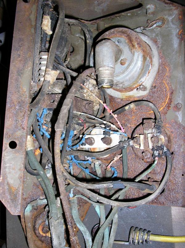 The cables all seem to have their own clamps before leaving the dash. Some are in pairs but that is it. This came off of a MK1 Cnd built carrier from early 1943. The ameter is a Cnd one. For some reason that face plate has gone white. Up close it has the black underneath. What is interesting is that the Instruction plate is zinc (?) whereas mine is etched brass. The Carrier that is 75#'s off of mine has this same style zinc plate. Of note is the lack of horn button but the two screws are still there. They hold a cable clamp each.