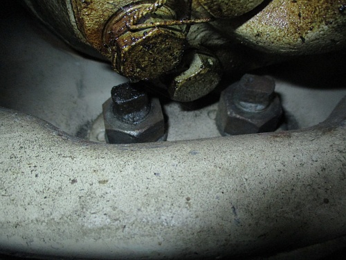 11. With a short (3")wrench turned the two lower pins on each wheel just the smallest amount to just cause brake drag/sound. Repeated this on all the wheels carefully re-tightening the locking nuts. When the pressure was removed the wheels turned smoothly with no drag.