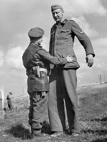 Out of shot of the photo, Cpl Robert's comrades and even the captured German soldiers sniggered together at the sight of the little and large encounter.