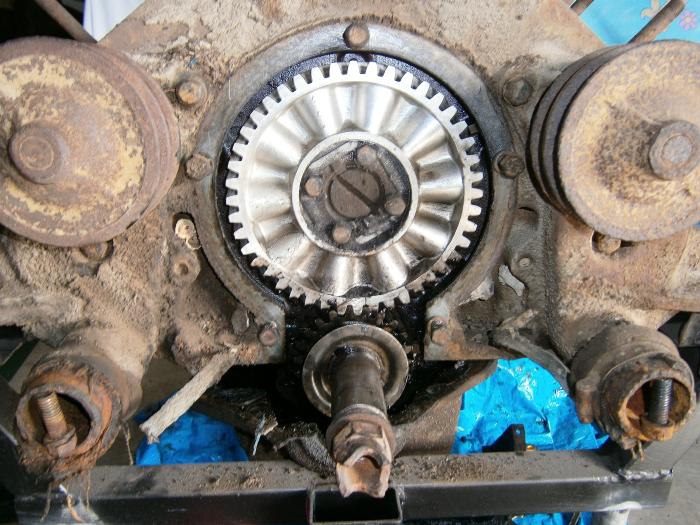 Following that, I got curious about what may lie.......lay......be hidden, under the sump of the engine. For some time I have been dreading the thought of looking, in case I find a rusted mass of useless metal parts. Fortunately that was NOT what I found. I had drained the oil many months ago. Upon removal of the sump (part way, to peek inside) everything looked to be in good condition, and it was obvious that the previous owner/s didn't pay too much attention to the oil change intervals. Thick sludge everywhere, but NO RUST! Also removed the timing gear cover, and found the gears in good shape there too. Notice anything interesting? See the two bolts sitting inside the water entry to the pumps? Against my expectations, and contrary to what my Flathead Restoration Manual warned, neither of the bolts inside the water jacket broke when being removed! Yay!!!!!