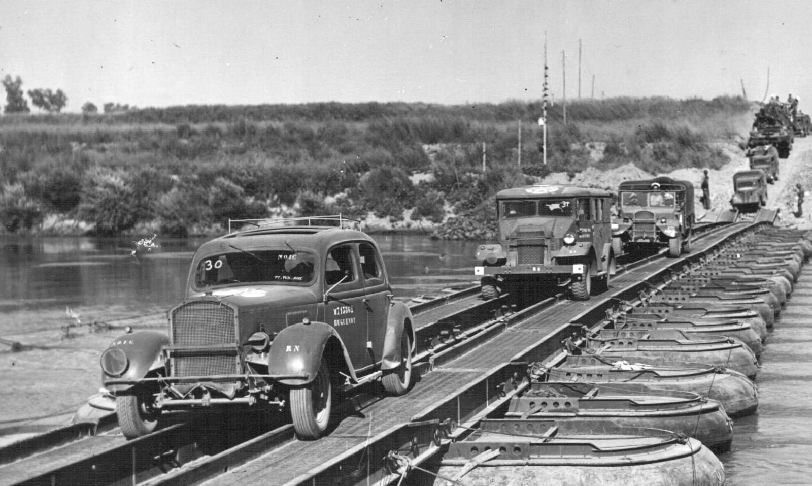 The original was captioned “Naval ratings in the advance port clearance party crossing a Bailey bridge over the Tiber on their way to Civitavecchia.” Source: https://www.iwm.org.uk/collections/i...ject/205156086