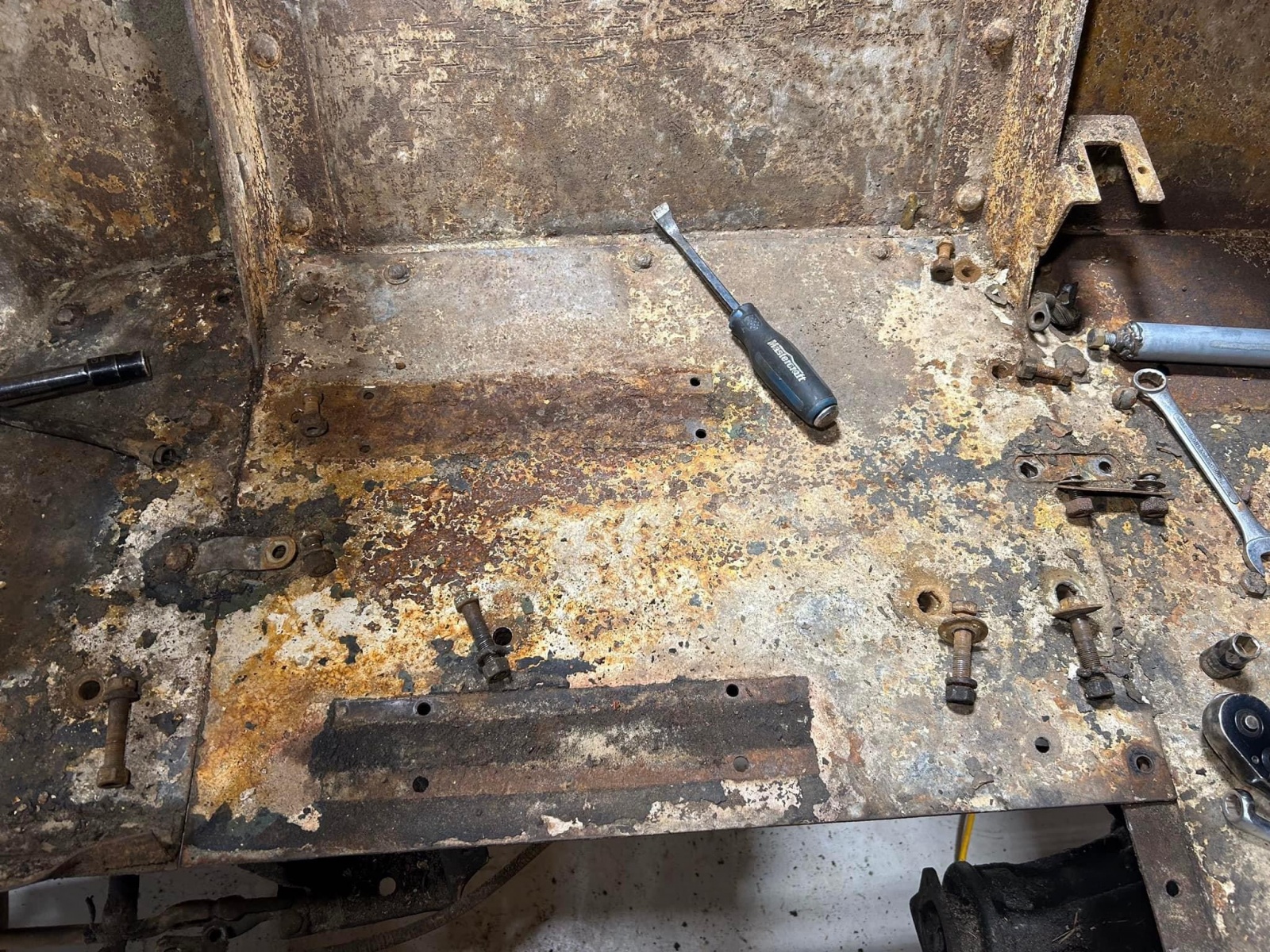 The oil filter was also removed from the frame rail. I took advantage of the warmer weather and got it all cleaned up and painted. When I was cleaning the grime off, I realized the filter had been over sprayed with KG#3. But only the side that was visible and not covered by the frame. When I removed the mounting brackets they were the proper gloss black and the filter was the early grey colour. For now the filter will stay grey. But once it’s back on the frame I plan on giving it the same overspray of KG#3 Lastly I’ve started removing the floor panels. Lots of sand, rust and other debris is coming out of the Otter. It’s amazing just how much crud has accumulated in this vehicle.