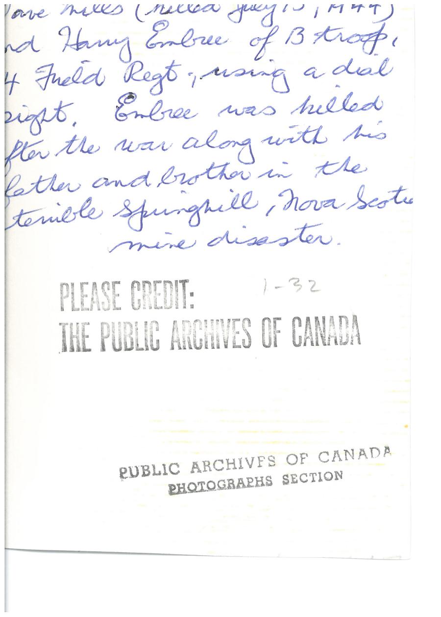 I have a few photos from the 14th Field Regiment, RCA. Some of the photos are Canadian archive photos, while some are from one of the troops. I have posted the back if there is a description. I have copies of the war diary, if your interested PM me. If you want a larger copy of the photos PM me.