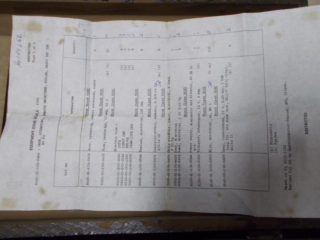 The inside is divided into three sections. The centre section holds the Remote Supply Unit for the Remote Receiver. It is a heavy little sucker and this central location in the wooden case places it directly under the carry handle on the lid of the case, thereby keeping things nice and balanced for the lucky Private who has to lug it about. The left section stores the two headsets and the cables and remote aerial needed to operate the Remote Receiver. The right side section held the spare valves and other delicates for the receiver. You can see on the lid above this section, a square of KimPac padding to protect the valves. The rest of this section of the case was likewise padded. Originally, a square paper label would have been glued to the inside of the lid, listing all the contents of the case. This has been replaced, as of July, 1962 by an envelope with a new List of Contents utilizing the newly introduced NATO Stock Numbers. Hence the large wash of tan paint across the front of the case covering the original wartime stencilled ID and the new NATO Stock Number Data applied there. It is possible that 1962 saw the end of the WS. No. 52 Tool Box as a separate entity in the Canadian Army supply system. David |