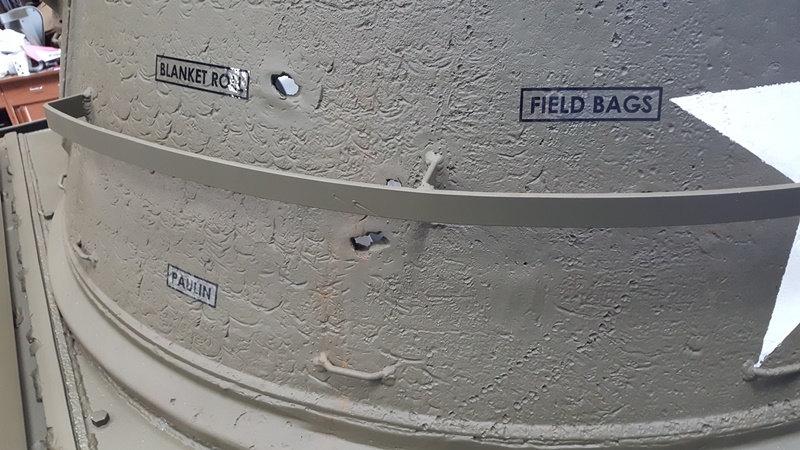 I’ve been busy doing a few small tidying up jobs on the M8. My master ‘to do’ list is gradually getting smaller so I guess that is a good sign. I had saved a trace of the star decal I used on the front of the hull and used the outline to paint the part circles on the inside of the front hatches. They came out pretty good. A Zero arrow in the turret for the sighting quadrant was next. Thanks to Jonathan for the dimensions which I used to make a small paint mask. I’ve done some more work on both sand skirts. I spent probably a day and a half dollying out the dents and creases in the second sand skirt. Even after that, I think I could have spent more time on it. The sand skirts were both pretty beaten up and when I got them they looked like a Sherman tank had driven over them, but I think what I have done so far will have to do. It still needs to look like it has been in a war. I used the last of the star paint masks I had to paint the US stars on the sides of the sand skirts and they look pretty good now. I will look to do something about the front guards at some point. I am not happy about those but they will do for the moment. I knocked up a very rough compass mount which will do until I can find (and afford) the real thing. I made up some exterior decals for the hull and tool locker covers. I am not convinced on the use of decals especially with some of the rougher steel surfaces and if (when) these come off I think I will make some paint masks instead. I had a long pin .50 cal pintle arrive for the trolley on the gun ring and I’ve been busy cleaning that up. The pintle came with a trolley stuck to it, with the pin from the pintle completely seized in the trolley socket, so I had to spend some time trying to get that out. I’ve also been doing a bit more work on the turret. I wasn’t happy with the movement of the turret and it seemed tight in places in its rotation. I removed the traverse gear and sure enough the problem appears to be the skirt on the turret binding with the ring on the hull. I had repaired a section of the skirt on this and it looks like it might have a few high spots on the inside which are rubbing on the paint on the outside of the raised ring on the hull. I’ll persevere with that. That’s all for this week.