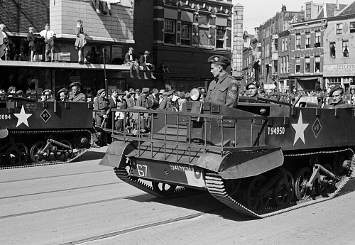 T16 T94950 with an interesting field modification. This photo was made during the Memorial D-Day Parade at the Potterstraat street in Utrecht in June 1945. All the men and their equipment were clearly polished up for this event. During wartime service no doubt the rack fitted on the front glacis would be stowed to the brim with the crew's belongings.