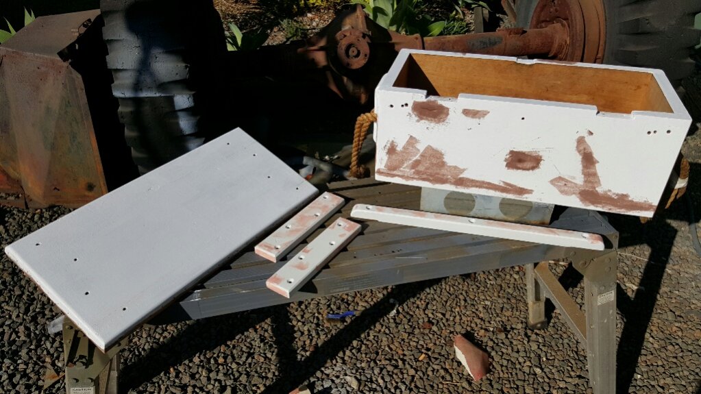 20160821_133046-resized-1024.jpg 20160821_133027-resized-1024.jpg The manufacturer did nice solid dovetail joints. 20160821_145038-resized-1024.jpg All the wood has been sanded, primed, and stop putty applied to the worst imperfections. 20160821_154802-resized-1024.jpg Even had enough time to get several small parts refinished in the final color. If you look really closely at the middle piece, you can see the manufacturers date stamp with year of production and the broad arrow. 20160821_154715-resized-1024.jpg Oh, and all the metal pieces have been sandblasted and finished, too. I won't be putting paint on those. I want a slightly more aesthetic look than just usable.
