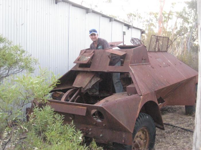 I thought I would share a few photos with you of our latest purchase. Some of you may have seen this vehicle on Ebay last year. I was fortunate to be the winner of one of Australias' rarest Armoured Vehicles. It is the MkI Rover Armoured Car. It was built on a Ford cab 12 F60L chassis. Weighing in at around 5 ton, it was in the same category as the Dingo Armoured Car, way too heavy to really perform in the wet. Only 238? were built before Australia was able to get more suitable vehicles from the US and England. As you can see from the photos it really is quite complete and will be a great vehicle when restored. It will make a great mate for our Dingo. I've attched a few photos of the Dingo, outside, Drivers compartment and radios. I do require a few items for the restoration of the Rover though if anyone can help? It is sadly missing the bonnet. I can make one if I can afford to buy enough 3/8 plate, but I thought I would try first to find an original. You just never know what someone has in the back yard? I also need some Cab 12 parts like the inner guards, inner and outer cowls, engine cover, for starters. One the other hand it has some very rare items still intact like the mesh "trench" covers, machine gun mounts, all storage compartments, all armoured visor covers. it came with one original fuel tank and a swag of spares. After I bought it I flew over to Perth to pack it and load it onto the transport. The chap I bought it from was a wonderful bloke. He also generously gave me a good going V8 sidevalve to get the old girl running again and a heap of extras. I hope someday in the not too distant future to send him some photos of her moving again. It's also missing the rear floor plates. Apparently the gunners seats folded into holes in the floor plates? If anyone has any info on how these worked I would appreciate it. It had a crew of five which means I need 5 37 kits, 5 ground sheets/ponchos, 5 respirators, 5 water bottles etc. It was armed with two Vickers Guns, two brens, a Thompson, a Sten, Owen and several .303's. Does anyone have any spare Bren and Vickers ammo boxes? Cheers Darren |