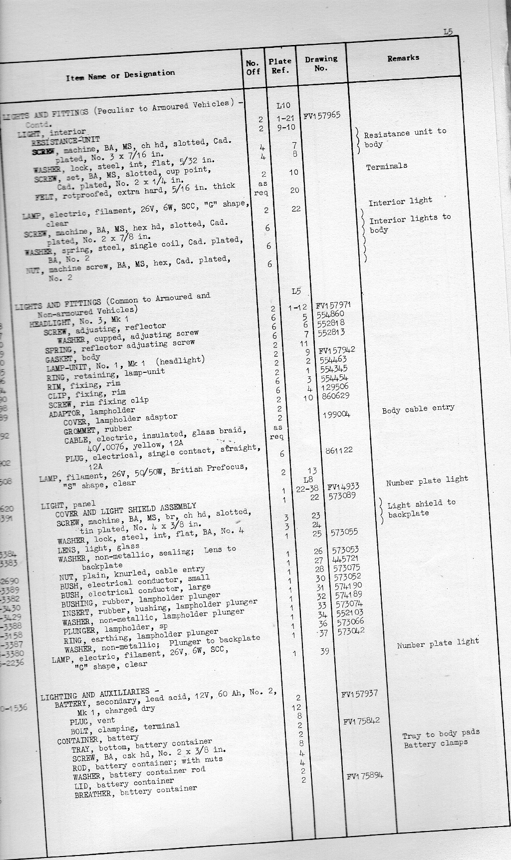 Rick, thanks for the reply, I do have all that info, what I don't have is any idea of what the bits look like, or the method they are used. However, I think I have been looking at it the wrong way. I assumed the battery was held down with a bracket on top, but assuming that the battery used was one of those aluminium cased jobbies, there was possibly a hold down point on the bottom which locked into the countersunk block with the parts on the list. (For the record, these blocks are not threaded UNF, but UNC.) If this is so, I will have to do a mod for modern batteries. Regards Rich.