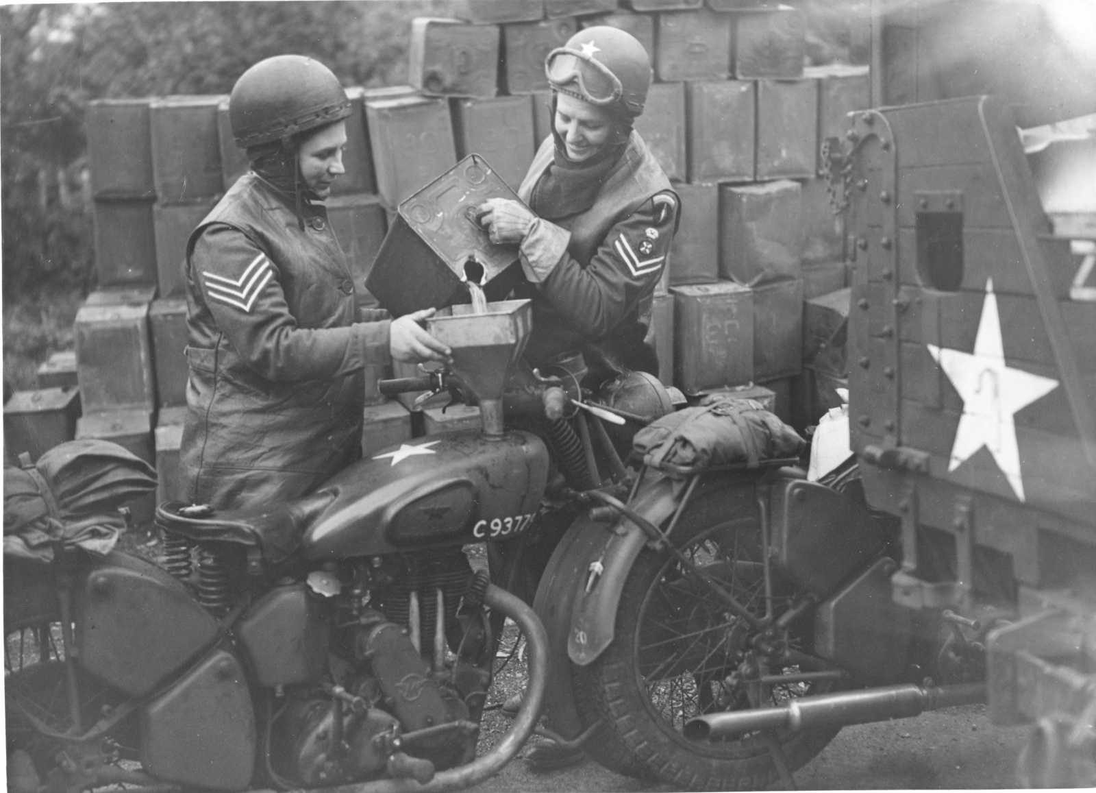 Sure, some of you are looking at the tins, other for some strange reason at the women. But for me it's the battledress and markings on the bikes. The formation flash seems to be SHAEF Supreme Headquarters Allied Expeditionary Force with trade or other badges below. British obviously otherwise the bike number would be "CC". If it is the supreme headquarters you have to wonder just how all the cute DR riders happened to be attached there.