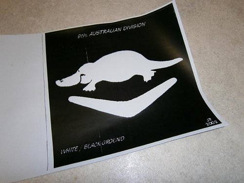 The 9th Australian Infantry Division, a white Platypus and Boomerang on a black ground. The Platypuswas taken from the 1937 9d (Nine Penny) Stamp. A brief history- Formed in 1940, was sent to the Middle East, allocated garrison duties while the 6th and 7th Divisions were sent to Greece, saw action in the battle for El Alamein alongside the British 8th. Army. More famously known as the Rat's of Tobruk, returned to Australia, then on to New Guinea after being reequipped, and fought against the Japanese in and around Finschafen, Lae, the Ramu and Markham Valleys and Madang alongside the 7th Division. Was later moved to Borneo and saw more action against the Japanese until the end of the War.