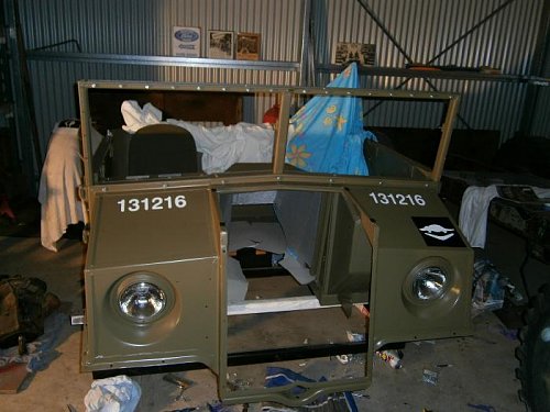 The sun had gone down but I wanted to get the numbers on TODAY, so I hooked up an old floodlight for ambiance. Because of the steaming turd of a day I had suffered, and because the numbers are my Fathers' service numbers, I was determined to finish the day on a positive note. To be frank, I would have fired up the old kerosene lamp if I had to do so to get the job done. When I stood back and took a good look, I have to confess I got a bit choked-up, and was thinking Dad would have loved to see this vehicle finished. He's been gone 6 years now and I guess at this time he would love to see any vehicle I suppose.