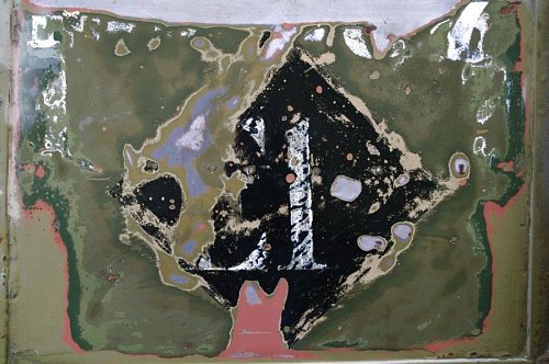 Here's some work I did on my door last year Jason, unfortunately you have rather less area to work with! However I notice you've found the pale green colour, which appears to be some kind of gloss repaint prior to DBG. It's an entirely different formulation to the matt paint coats, you'll find it goes quite soft when rubbed back wet, and tends to peel and tear instead of powdering, much like cheap plastic house paint. The pale grey colour you're seeing underneath is heavily oxidized, you'll find it's considerably darker when rubbed back slightly. The reddish colour you've found underneath is yet to appear on the door, which would seem to indicate a disruptive pattern. Likewise the sandy colour only appears in certain areas on the door. If you work carefully in this area you should find the factory camo underneath, however I don't know what part of the vehicle you've photographed so I can't say whether you'll find Light Stone pattern.