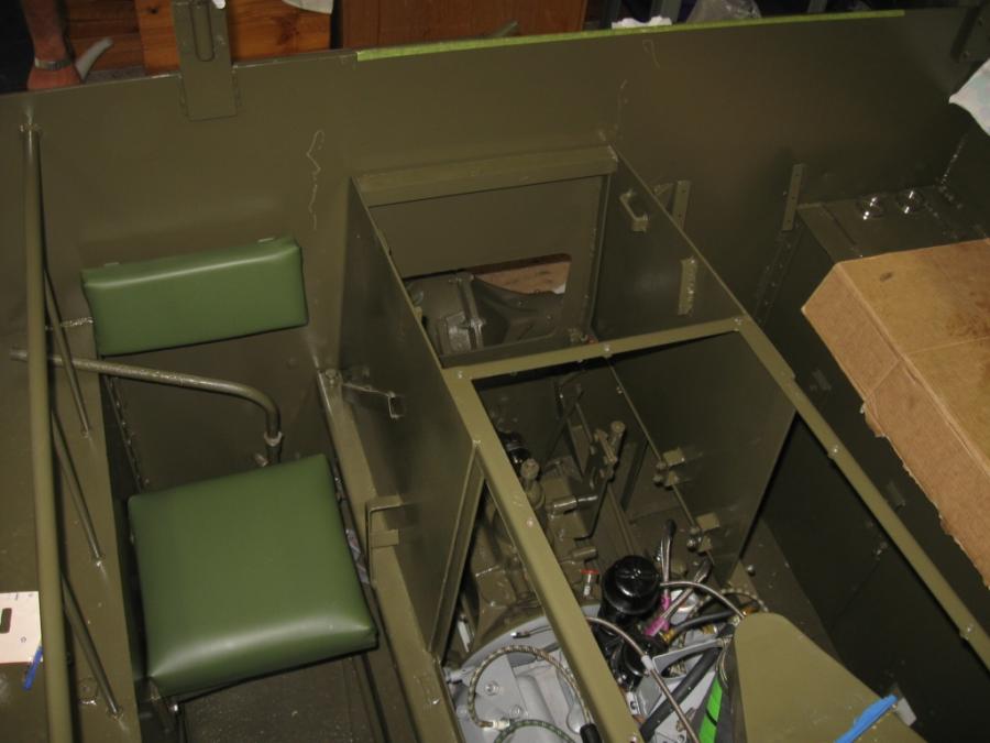 Saturday- it rained all day. Using Euan's clutch rods as samples (borrowed), I bent up my rod in the same style; however, my rod required its own unique bends to get it from the pivot linkage on the centre bulkhead to the clutch throw-out are/lever. This took about 2 hours of bending and test fitting to get right. It is in now. I also cut and installed the leather grommet for the accelerator & clutch rod to pass through on the engine bay divider plate. With the rods in, there was no excuse not to install the radiator. With my wife assisting, we lifted it over the hull side and down into position. I did discover that the Macs Auto radiator mount kit, that I bought months ago, did not quite fit. The bolts are too short due to the extra thickness of the engine/radiator C channel rails in the hull. To over come this I got two bolts a little bit longer and drilled them for the split pins, otherwise the rest of the kit was usable. Another point to note, I cut my clutch rods from the lengths listed in the parts book. These lengths are incorrect, I think they got the front & rear mixed up, Will find out for sure when I get to install the front clutch rod.
