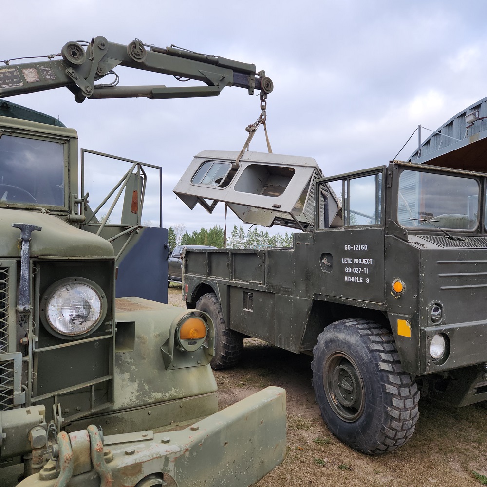 The cab was built post service. It looks like someone capable of aircraft work built it & it is very functional. The original trucks had either a fiberglass hard top as you described or a soft top. This truck has evidence of the soft top.