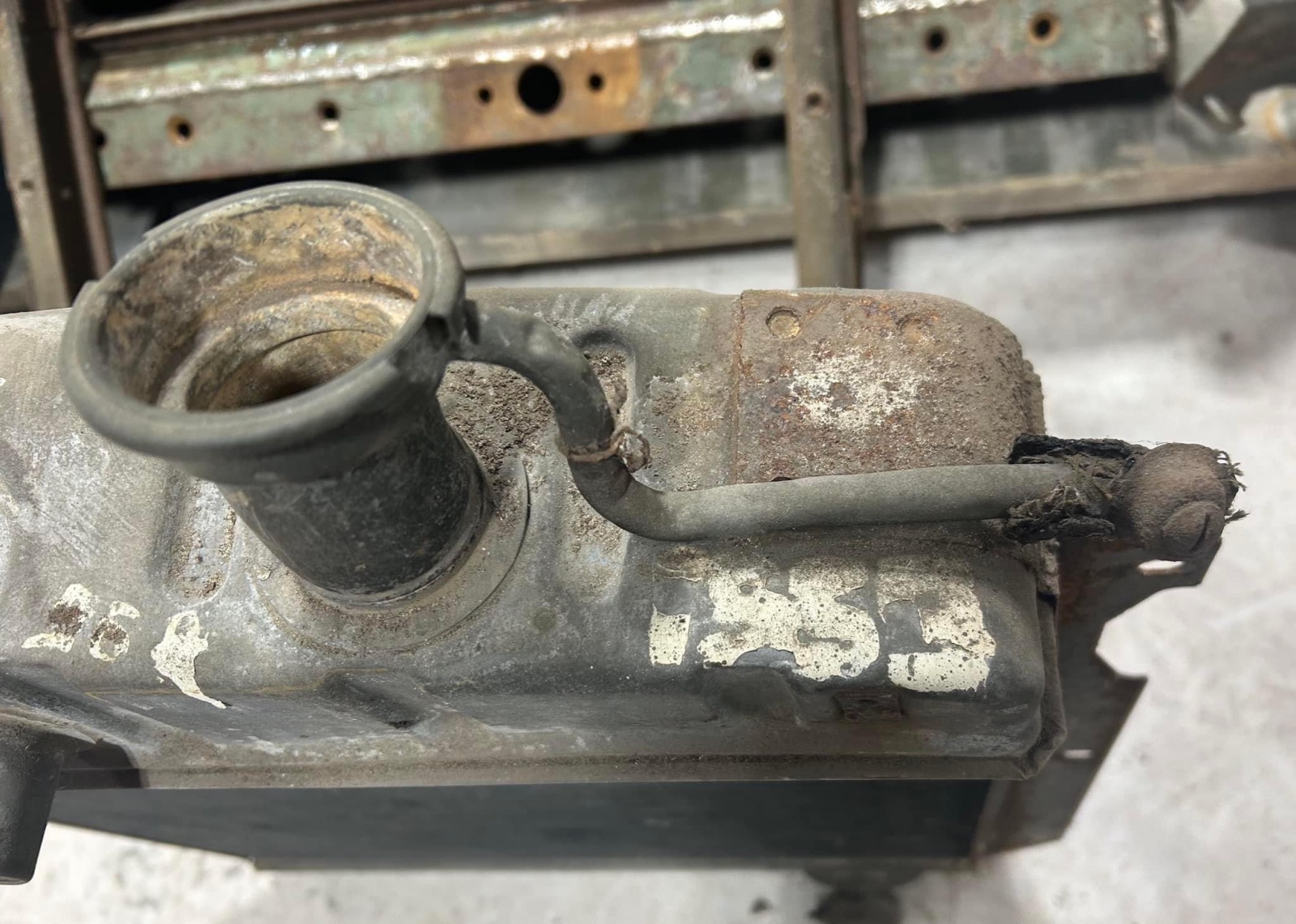 Radiator removed from the chassis. It’s quite the heavy duty mount that it sits in. Nice to see all the KG#3 paint when taking things apart. Interesting Dutch rebuild brass tag on the radiator top tank. Also some hand painted white numbers on the top of the tank. Appears to be 1953 and 254.