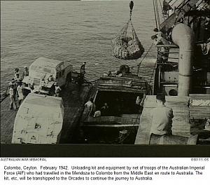 Mike, I wonder if we can track these Cab 12 FATs trans-shipped at Colombo en route to Australia. Photo undated but presence of Andes indicates late February after Orcades returned from Java debacle (Andes embarked Suez 18 February carrying advance party 2/11 Field Regiment; disembarked Adelaide 16 March). Orcades disembarked Adelaide 14 March. If WO number H4522081 can be traced in vehicle records it may shed light on how these vehicles were eventually processed under MECH 314.