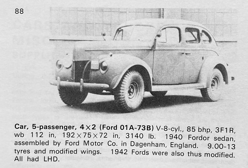 Now,this is where it gets interesting! The 01A Regular Fordor Sedan assembled in Dagenham for the military is supposed to have had 6.00 x 16 wheels, although the 'diverted' 01A Saloon and Saloon Deluxe had 9.00x13 tyres. I assume that these latter were ex-French US Fords. Note no reference in the 1942 Ford listing of 'E01A' or 'C01A'or EC01A'. The top photo looks as though it is an official shot, of a British order car..the Canadian C01A cars assembled in Aldershot appear to have had different blackout headlamps etc. Last edited by David_Hayward (RIP); 14-08-05 at 23:56. |
